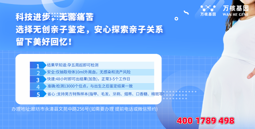 办理地址:廊坊市永清县文苑中路256号(如需要办理 提前电话或微信预约)-预约电话:4001789498简介:永清亲子鉴定基因检测服务咨询点为需要的客户提供永清亲子鉴定查询预约。永清亲子鉴定基因检测主要从事基因检测咨询服务。DNA基因咨询鉴定内容丰富,如:上户口、司法、隐私、移民、胎儿、亲缘等亲子鉴定项目咨询服务。
